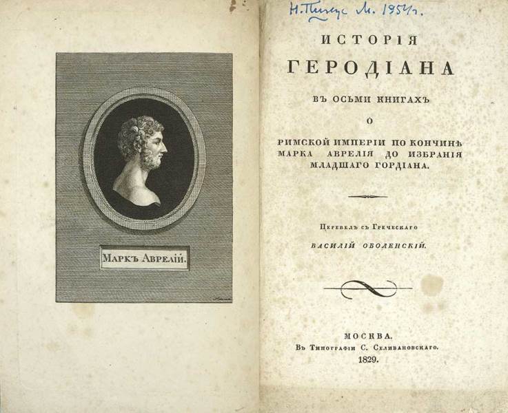 Геродиан. История Геродиана в осьми книгах о Римской империи по кончине Марка Аврелия до избрания младшего Гордиана. Пер. с греч. В. Оболенский. М.: В Тип. С. Селивановского, 1829.