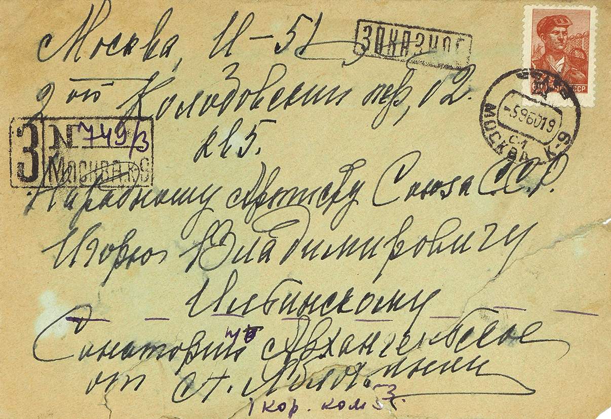 В письме А. Яблочкина спрашивает будет ли отмечаться в Малом театре сотое представление спектакля «Ярмарка тщеславия». 2 л., рукопись. 17 х 14,5 см. В конверте, прошедшем почту.Происхождение: архив семьи народного артиста СССР И.В. Ильинского