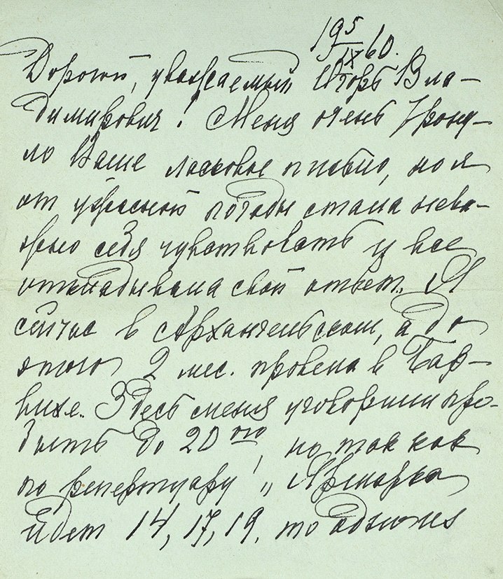 Яблочкина, Александра Александровна (1866-1964). [Автограф]. Письмо актрисы А.А. Яблочкиной И.В. Ильинскому от 5/ IX 1960 г.